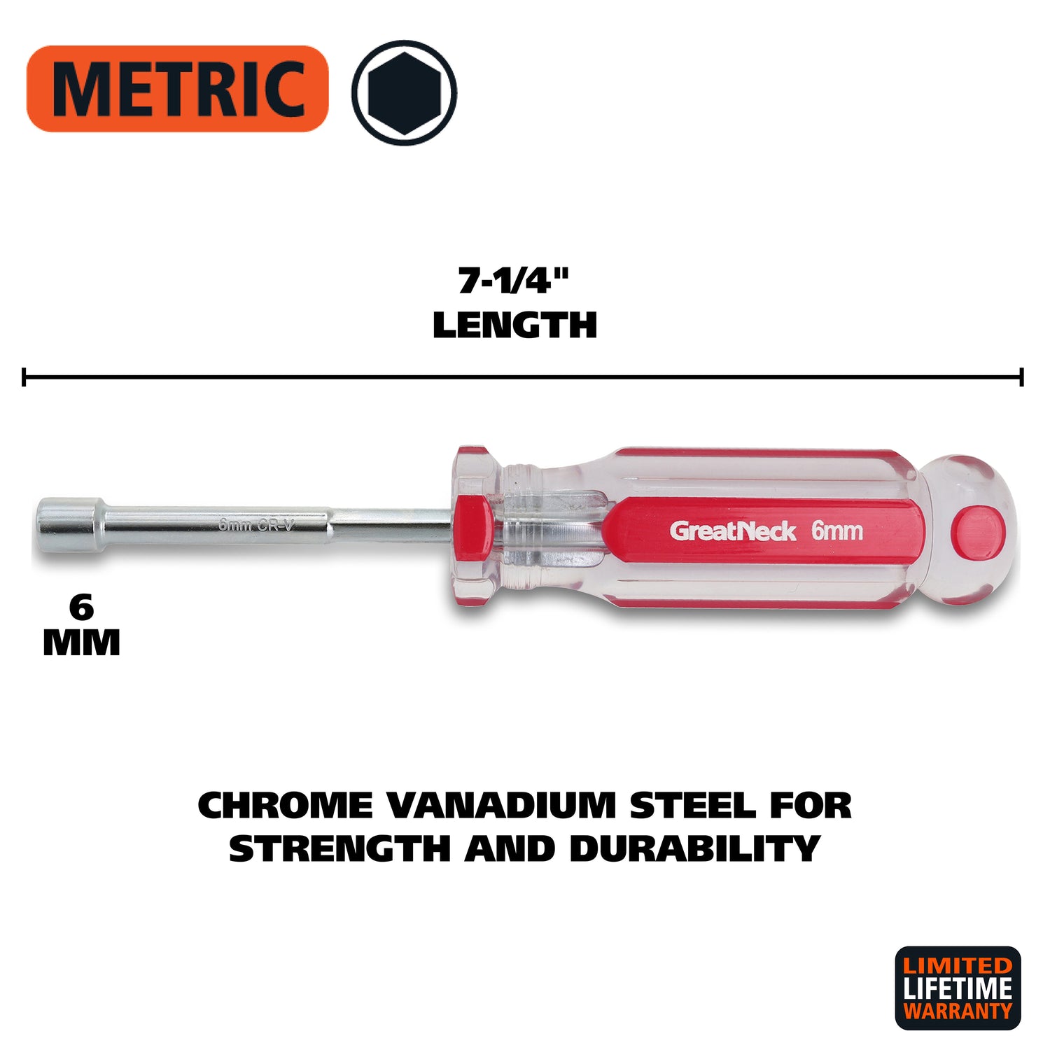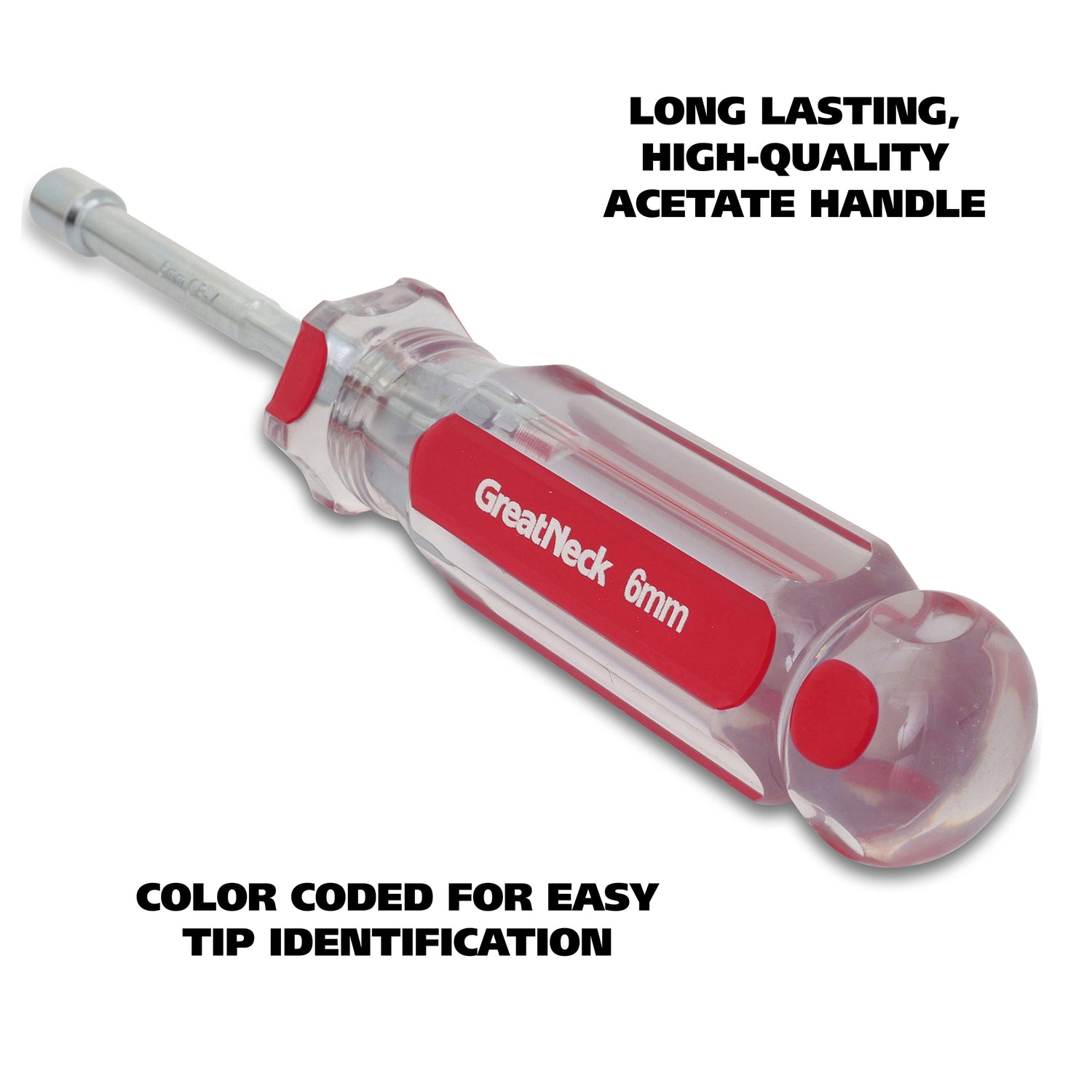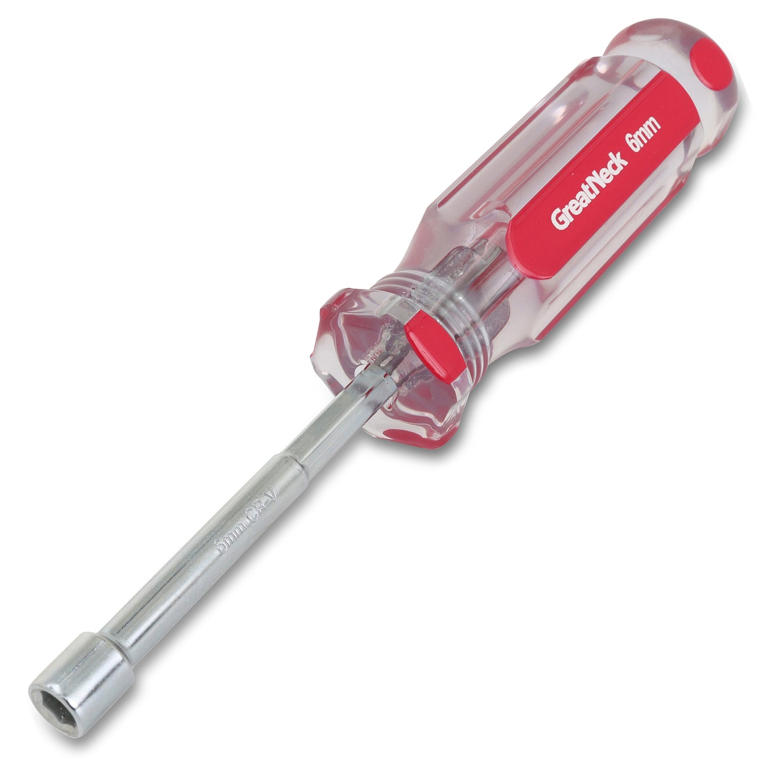 The GreatNeck NDC6 6 mm Nut Driver combines a high-quality acetate handle for the most demanding applications with a hollow shaft that’s designed for long bolt applications. The driver is constructed with chrome vanadium steel for strength and durability and color coded for easy tip identification.