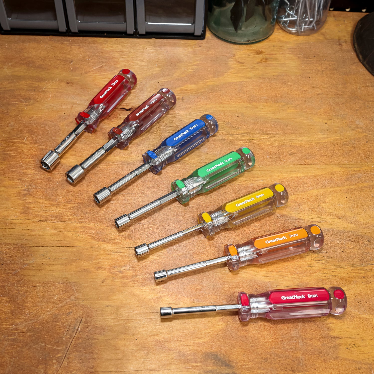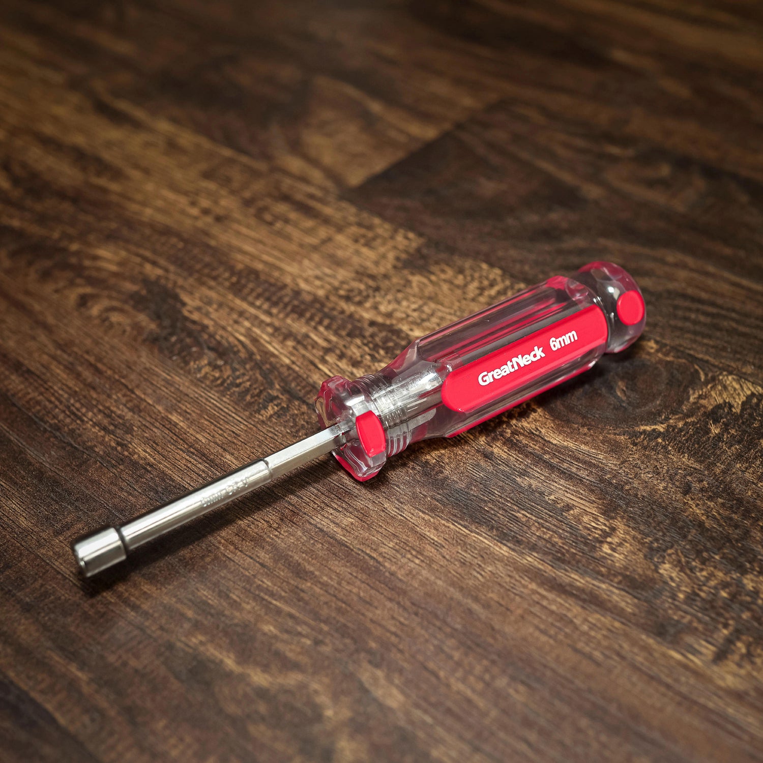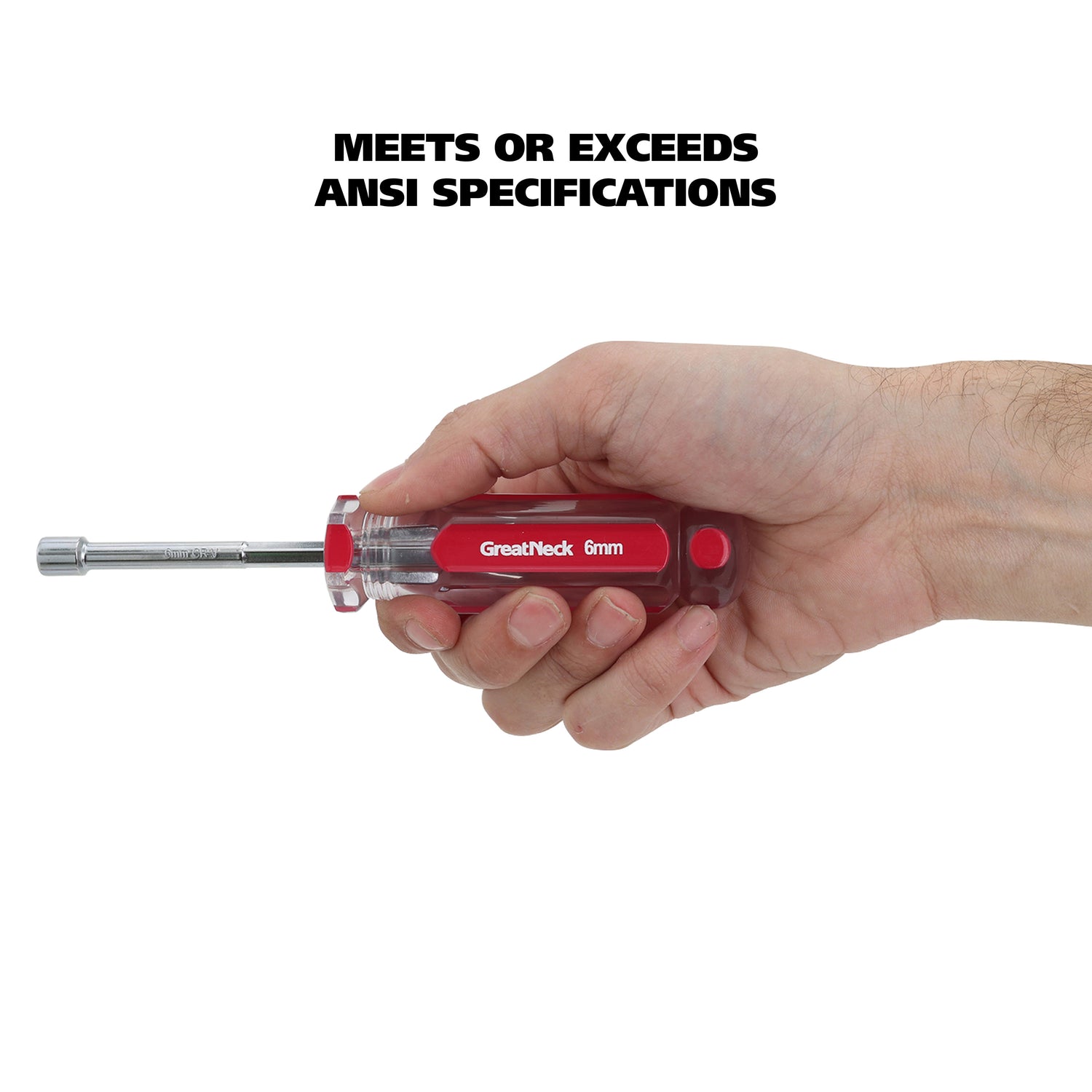 The GreatNeck NDC6 6 mm Nut Driver combines a high-quality acetate handle for the most demanding applications with a hollow shaft that’s designed for long bolt applications. The driver is constructed with chrome vanadium steel for strength and durability and color coded for easy tip identification.