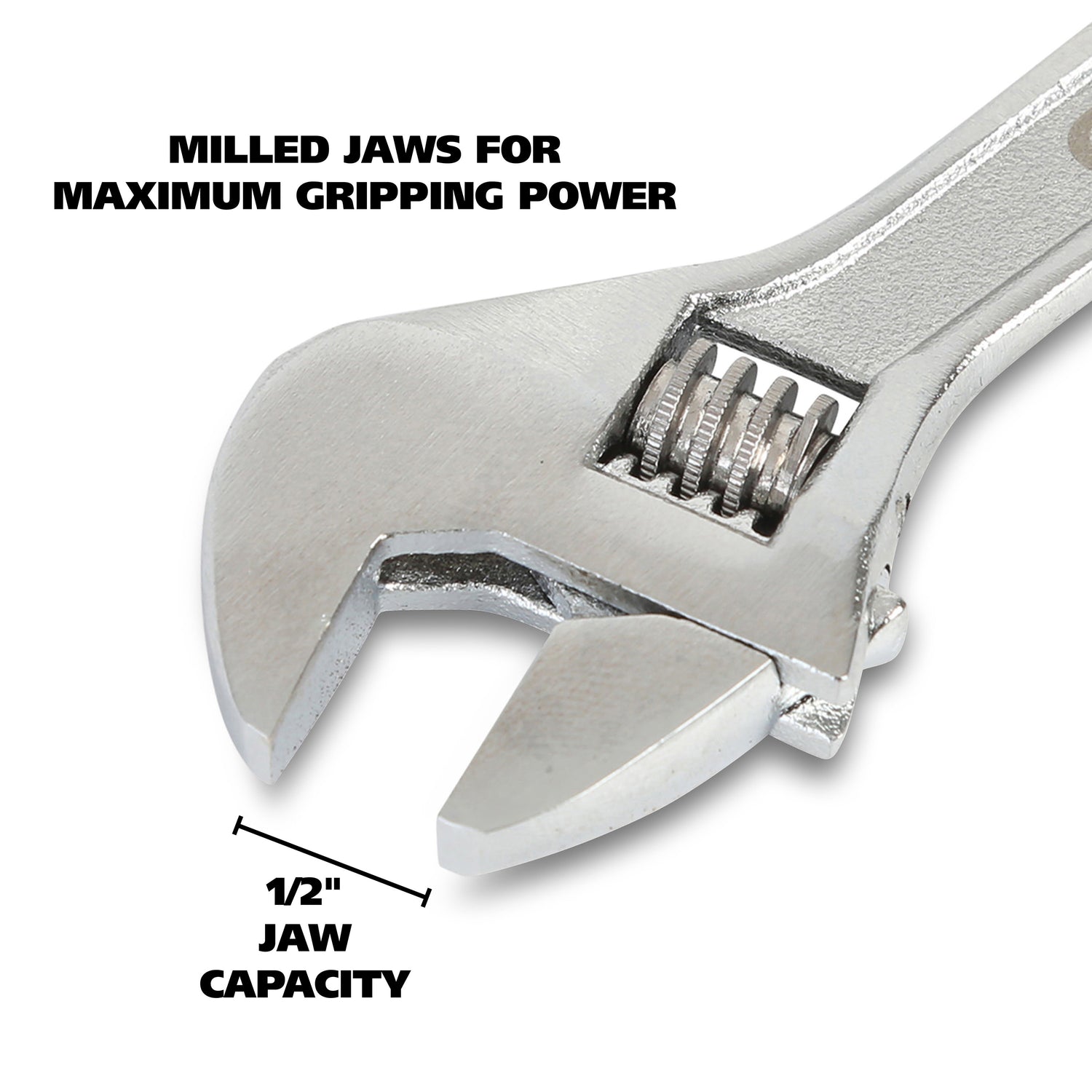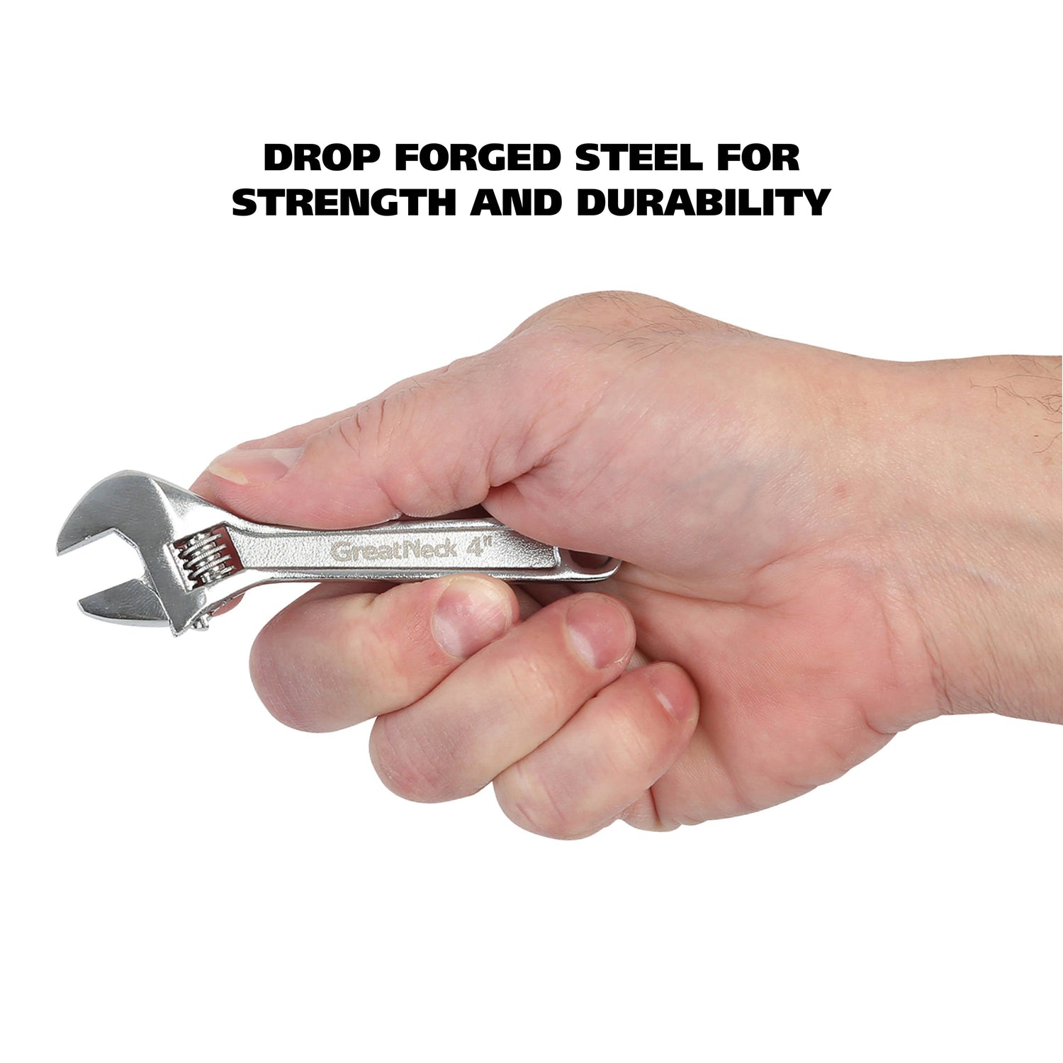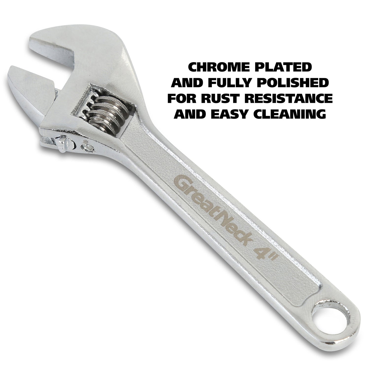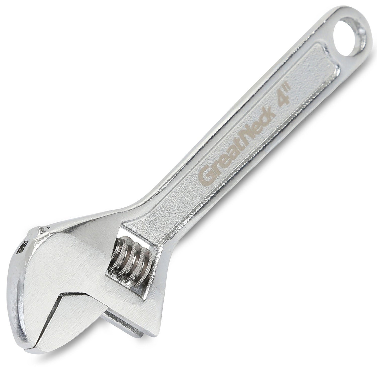 The GreatNeck 4 Inch Adjustable Wrench is essential for any tool box and can be used in a wide variety of tasks at home and on the jobsite. It features drop forged steel for strength and durability, and milled jaws to provide superior gripping power for tightening nuts and bolts. It is chrome plated and fully polished to resist rust and for easy cleaning.
